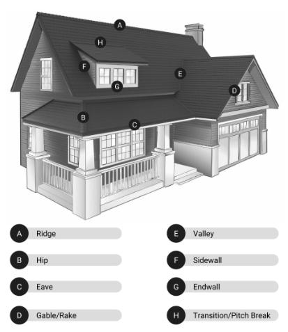 - Transition – Lower end of steeper sloped roof section transitions into the upper end of a shallower sloped roof section. Often referred to as pitch break.